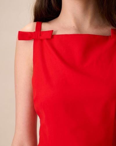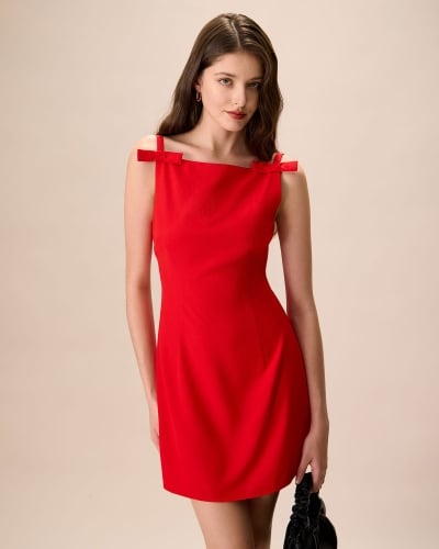 Women's Red Boat Neck Bowknot Mini Dress