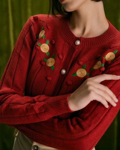 The Brick Red Floral Embroidered Cardigan