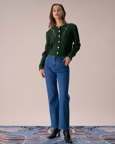 The Green Round Neck Embroidery Cardigan