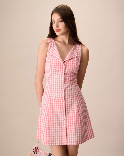 Women's Pink V-Neck Plaid Cotton Mini Dress